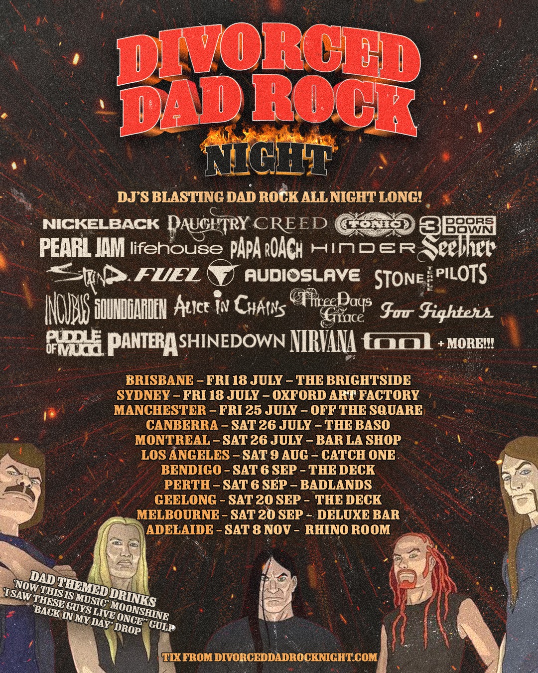 Sitting at home on your fold out chair in your new 1 bedroom unit blasting some Divorced Dad Rock? Come enjoy a night out where you get to hear your favourite grungy, grunty, groany bands back when music was ‘actually good’ 😎